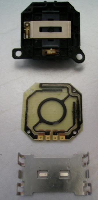 Al abrirlo ( Abriendo los clips marcados con un " 2" y quitando la base con el " 1" ), consta de 3 piezas planas con un agujero en medio para el jostick, la 1º es una chapita metalica que servira de refuerzo ( es la de mas al fondo) las otras dos estan en cruz una apoyada sobre la otra, bien, cada una se mueve o en horizontal o en vertical solamente, y tienen 2 pestañitas que conectaran con la pieza que marque antes con el " 1 ",